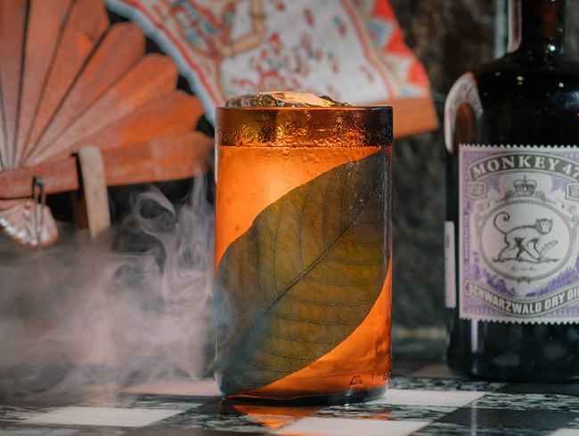 Crafted as a tribute to Bali's rich herbal heritage, it blends botanical elements into a refined, contemporary serve, presented with a young guava leaf in a repurposed Monkey 47 bottle—an expression of tradition, flavor, and form.